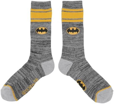 Step up your sock game with these men's black Batman athletic crew socks. Featuring bold yellow stripes and embroidered Batman logo art, they bring a heroic touch to your everyday wear. Crafted from a flexible blend of 98% polyester and 2% spandex for comfort, these socks fit men's sock size 10–13 and shoe size 8–12. Equipped with cushioned footbeds and arch compression, these socks deliver reliable support with every step. For easy care, machine wash them on cold with like colors and tumble dry on low heat. Do not bleach.