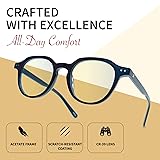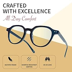 DESIGNED FOR MEN AND WOMEN, BUILT FOR STYLE: Blue light glasses for men with a modern, versatile look. Available in black, clear, and tortoise frames to match work, gaming, or everyday style. Lightweight frame = all-day comfort. REDUCE EYE STRAIN ON SCREENS – Filters 77% of harmful blue light (380–450 nm) while keeping text sharp and colors true. Ideal computer glasses for reading documents, coding, or browsing on phones, tablets, and laptops. COMFORTABLE FOR READING – Clear CR-39 lenses protect your eyes from digital glare without magnification. Perfect for men who want stylish reading eyewear that prevents fatigue during long hours with books or e-readers. SUPPORT BETTER SLEEP – Minimize evening screen glare to help maintain melatonin levels and improve sleep quality. Clear lenses protect your rhythm without the yellow tint of traditional gaming glasses. PREMIUM QUALITY & DURABILITY – Scratch-resistant CR-39 lenses with UV400 protection + durable acetate frame = clarity, comfort, and lasting wear. Non-prescription, hypoallergenic, and built to handle everyday use.