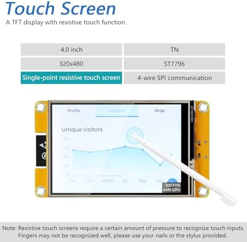 - Onboard Screen: 4.0 inch, 320x480 pixel, TN type TFT, ST7796 driver IC, 4-wire SPI communication, single-point resistive touch screen (Note: Resistive touch screens require a certain amount of pressure to recognize touch inputs. Fingers may not be recognized well, please use your nails or the stylus provided)