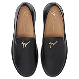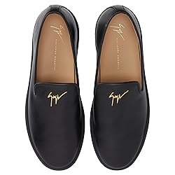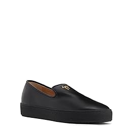 - Leather slip-ons with metal Signature detail and rubber sole.