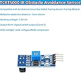 - TCRT5000 infrared sensor: compatible with Arduino smart car robot tracking sensor moduleReflection detection distance: 1mm~25mmWorking voltage: 3.3V-5VOutput form: digital switch output (0 and 1)Wide voltage: using wide voltage LM393 comparatorFeatures:1. Using TCRT5000 infrared reflection sensor2. Detection reflection distance: 1mm~25mm applicable3. Comparator output, pure signal, good waveform, strong driving ability, greater than 15mA4. Equipped with multi-turn adjustable precision potentiometer to adjust sensitivity5. Working voltage: 3.3V-5V6. Output form: digital switch output (0 and 1)7. Using terminal voltage LM393 comparator8. Scope of application: electric energy meter pulse data sampling; fax machine shredder paper detection; obstacle detection; black and white line detectionNote:Please connect correctly, do not connect the negative pole, otherwise it may burn the electronic components on the circuit board.Compatible with Raspberry Pi. Please set the MCU's I/0 port to input/receive mode, otherwise it cannot be used.For other MCUs, or more advanced control boards such as ARM, if you need to set the I/0 port to input/output mode, you must also set it to input/receive mode, otherwise it cannot be used.The 51 series microcontroller does not need to set the input/output mode and can be used directly.