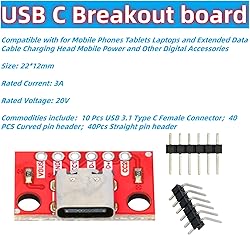 - MTDELE 10Pcs USB Type C Breakout Board Serial Basic Female Connector Type PCB Converter Board With Pin HeaderUSB C Breakout board:Compatible with for Mobile Phones Tablets Laptops and Extended Data Cable Charging Head Mobile Power and Other Digital AccessoriesSize: 22*12mmRated Current: 3ARated Voltage: 20VCommodities include:10 Pcs USB 3.1 Type C Female Connector;40 PCS Curved pin header;40Pcs Straight pin header