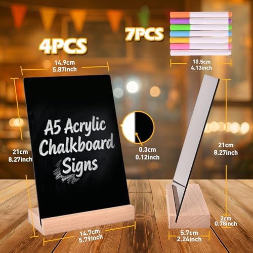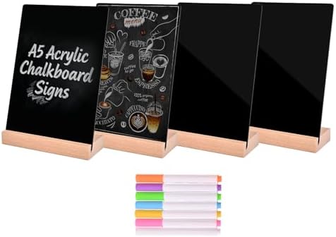 4 Pack Mini Chalkboard Signs - 8x6 inch Acrylic Chalk Board - Small Chalkboard Signs with Beech Base - Double Sided Blackboard for Display Menus, Food Signs, Message Boards, Table Numbers