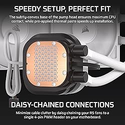 Simple, Focused CPU Cooling – Powerful, low-noise performance ensures your CPU reach its full potential, while a customizable LCD screen adds a touch of style to your system Efficient, Low-Noise Pump – Keeps coolant circulating at a high flow rate while staying whisper-quiet at just 20 dBA Convex Cold Plate with Pre-Applied Thermal Paste – The slightly convex design ensures maximum contact with the CPU’s integrated heat spreader, while pre-applied thermal paste speeds up installation RS120 Fans – High static pressure RS fans push air efficiently through the radiator, while CORSAIR AirGuide technology and Magnetic Dome bearings deliver strong cooling with low noise