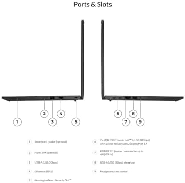 - Plenty of ports, including: 1x USB-A (USB 5Gbps / USB 3.2 Gen 1); 1x USB-A (USB 5Gbps / USB 3.2 Gen 1), Always On; 2x USB-C (Thunderbolt 4 / USB4 40Gbps), with PD 3.0 and DisplayPort 1.4; 1x HDMI 2.1, up to 4K/60Hz; 1x Headphone / microphone combo jack (3.5mm); 1x Ethernet (RJ-45); and 1x Security keyhole.