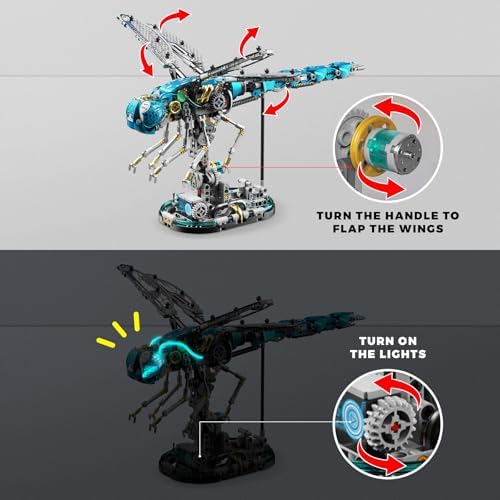 - Dynamic Dual-Sided LED Lighting: This dragonfly building sets glows with LED lights on both sides, creating a mesmerizing flying in the sky ambiance. The lights sync with mechanical movements, toggle the hand crank to watch the dragonfly "fly". At the same time, its body illuminates, making it a stunning decorative centerpiece for home, offices, or insect-themed spaces