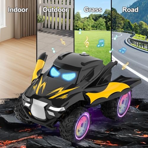 - 6 Sound Modes - Amp Up the Fun: Choose from 4 high-energy music tracks, realistic revving engine sounds, or quiet mode for stealth play. Makes driving way more exciting! Perfect for indoor, outdoor, and backyard play.This multi-function 2.4GHz RC stunt car is a dream gift that kids master instantly