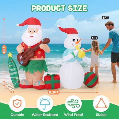 - ⛄【Waterproof & Durable Material】:Crafted from superior durable tear-resistant 210T polyester, with excellent stitching, good airtightness, rain-resistant and anti-fading, this hawaiian santa inflatable christmas blow up yard decorations ensure long-lasting performance in various weather conditions, including the UL certified plug, adhere to rigorous safety standards. Please note that the included UL-certified adapter is not waterproof and should be used with proper protection.