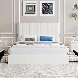 - Transform your bedroom with this stylish and functional storage bed frame, designed to elevate your space. Built with a durable metal frame and solid wood slats for excellent mattress support (no box spring needed!), it ensures lasting comfort. Sink into luxury against the premium velvet-upholstered headboard, featuring sleek vertical ribbing and adjustable height for the perfect fit during late-night reading or weekend lounging. Best of all, maximize your space effortlessly with four deep, smooth-gliding drawers tucked neatly beneath the platform. These whisper-quiet drawers on rollers keep clutter out of sight yet conveniently within reach. Every component ships in a single box for easy delivery, and straightforward assembly means you can enjoy your sophisticated new centerpiece in minutes. Perfect for optimizing a cozy apartment or refreshing a spacious master suite, this bed seamlessly blends smart storage with modern style.
