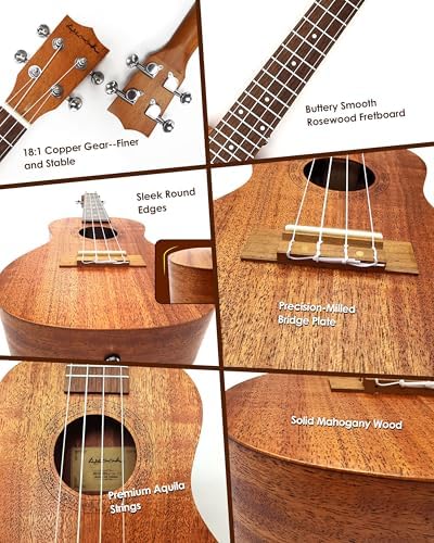 - 1.TIMELESS MAHOGANY BEAUTY: Handcrafted from premium mahogany wood, the KYOOH 23 inch ukulele radiates a warm, reddish-brown glow with a distinctive grain pattern that deepens in charm over time. Paired with premium Aquila strings, it delivers a balanced, resonant tone with crystal-clear midrange—ideal for ukulele for beginners and seasoned players alike
