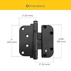 NON-REMOVABLE PIN: Equipped with a fixed hinge pin to reduce access to the joint area, offering a method of restriction for hinge separation in areas where pin-based opening must be minimized or discouraged. MATTE BLACK FINISH: Features a steel base with matte black outer coating, applied for surface uniformity across similar trim hardware and to maintain visual consistency in hardware groupings or installations. NON-REMOVABLE PIN: Equipped with a fixed hinge pin to reduce access to the joint area, offering a method of restriction for hinge separation in areas where pin-based opening must be minimized or discouraged. TWO-PIECE SET HINGE DESIGN: Includes Frame and Door hinge leaves with 4" and 3-5/8" heights, door leaf thickness is 19/32", configured to support doors and frames with unequal mounting profiles or structural offsets in various architectural layouts. 2D ADJUSTABLE FUNCTION: Provides dual-axis adjustability to permit vertical and horizontal changes after mounting, offering movement flexibility for proper door placement without needing to remove or refit the hinge. MAINTENANCE-FREE BEARINGS: Bearings are integrated in a way that does not require additional oiling or regular lubrication. This reduces the need for recurring maintenance tasks and supports consistent movement. NOT INTENDED FOR COMMERCIAL OR FIRE-RATED DOORS: This item is not designed for use with commercial-grade or fire-rated doors. It lacks certification for fire resistance and does not meet specifications needed in high-use or regulated access.
