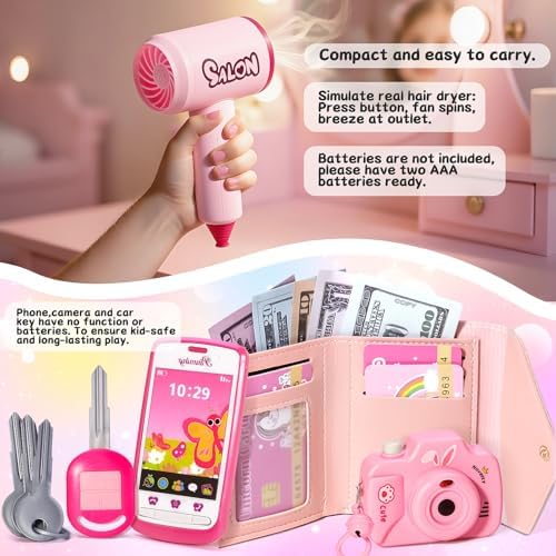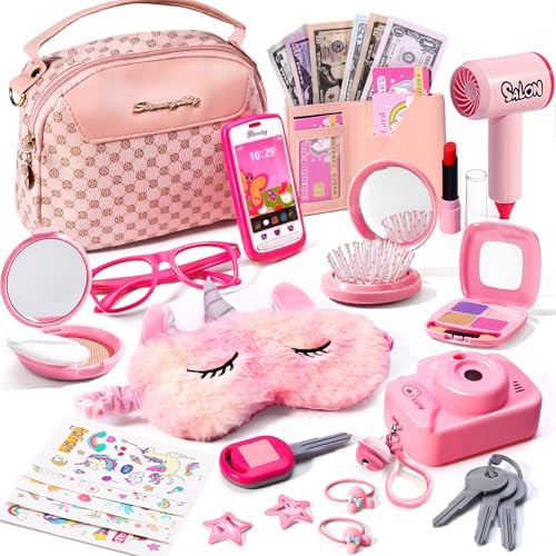 - MY FIRST PURSE SET: This kids play purse comes with everything your little one needs for imaginative play! It includes Handbag*1, Wallet*1, Comb with Mirror*1, Glasses Frame*1, Phone*1, Hair Dryer*1, Powder Compact*1, Eyeshadow Palette*1, Lipstick*1, Key*3, Car key*1, Unicorn Tattoo Sticker*5, Unicorn Eye Mask*1, Unicorn Credit Card*3, Camera with Keychain*1, Cash*6, Hair Tie*2, Hair Clip*2. Hours of fun: Pretend makeup for toddlers to play grown-ups.
