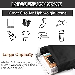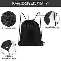 Large Capacity: Measuring 16.5 x 13.5 in, our drawstring backpack is ideal for carrying exercise clothes and shoes, towels, and so on, whether you're heading to the gym, beach, or party, these drawstring bags are versatile enough to meet all your needs Lightweight and Foldable Design: The lightweight and foldable design also allows for easy storage and portability, making it for travel carrying on the go, you can pull both sides of the string outward, tieing up the top of the bag to the item falls out Classical Colors: Black classical colors are easy to match, so these sports bags are very suitable for sports bags or fitness bags; Regardless men and women can use these bags drawstring to carry items, and the drawstring backpack will simplify your life Durable and Long-lasting Material: Crafted from polyester, our draw string back bag features reinforced corners with PU leather for exceptional durability; They are designed to withstand everyday wear and tear, providing reliable, long-lasting use Wide Application: This drawstring backpack is suitable for all occasions, parties, outdoor activities, sports, holidays, supermarkets, and travel beaches. It can also be used as a festive packaging, and it can also be used as a blessing bag