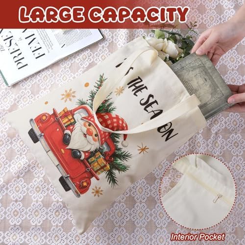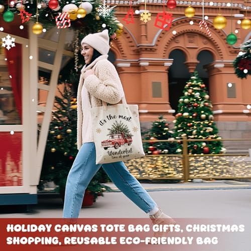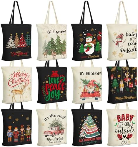 12 Pcs Christmas Canvas Tote Bags with Pockets Funny Plaid Xmas Tree Truck Snowman Pattern Reusable Grocery Shopping Shoulder Bag Xmas Gift for Holiday Gift Wrapping Grocery Party Supplies