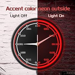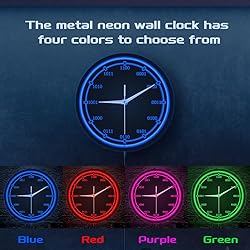 【Neon Lighting】: Enjoy the dazzling glow of neon clocks. LED neon signs are available in purple, red, green, and blue. Neon light is connected to sockets via cord 【High-Quality Material】: This 12 inch programmer wall clock features a metal frame and glass dial. The printed patterns are clear and vivid 【Silent Movement】: Our decorative wall clock runs silently and accurately, without ticking. Convenient wall-mounted design for easy installation 【Battery Power】: The modern clock requires one AA battery (not included). Note: Using regular carbon-zinc batteries will extend the life of the clock 【Modern Design Improves Home Look】: Night light and clock in one. Practicality and decoration combined. The neon clock is suitable for the bedroom, living room, kitchen, office, garage, bathroom, or any room