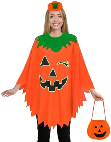 Yezmo Pumpkin Costume for Women, Pumpkin Poncho Cape Glow in the Dark with Headband Candy Bag for Halloween Dress Up