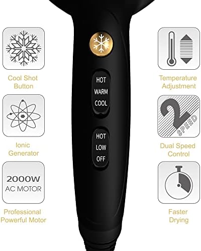 JINRI Hair Dryer, 2000W, 3 Heat & 2 Speed, with Diffuser, with Concentrator, Detachable Air Intake, Ionic Technology & Infrared - Black, Hanging Strap, Non-Foldable
