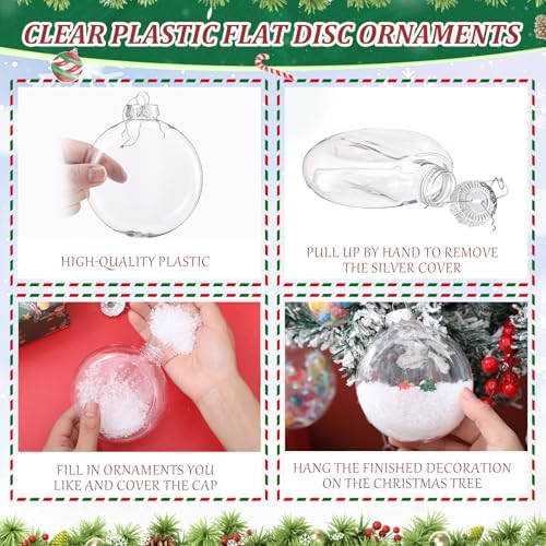 24 Pcs 4 inch/100mm Christmas Ornaments Balls for Crafts Fillable Flat Disc, Clear Plastic Ornament Balls, Christmas DIY Transparent Bulbs, DIY Empty Glass Disc Decorations Ball to Paint