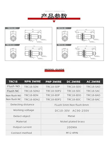 Proximity SensorsDescription: Metal detection, sensorModel:TRC18-8DOType: Inductive Proximity SensorOrigin: Zhejiang, ChinaApplication: IndustrialTheory: Position SensorsOutput: 2 linesOutput voltage: 10-30VDCDiameter: 18 mmTest distance: 8mm/non-flushMaterial: BrassProtection level: IP67Packaging: StandardOutput mode: 24VDC 2-wireCertificate: CCC CEDetection object: MetalProduct Type: Connector