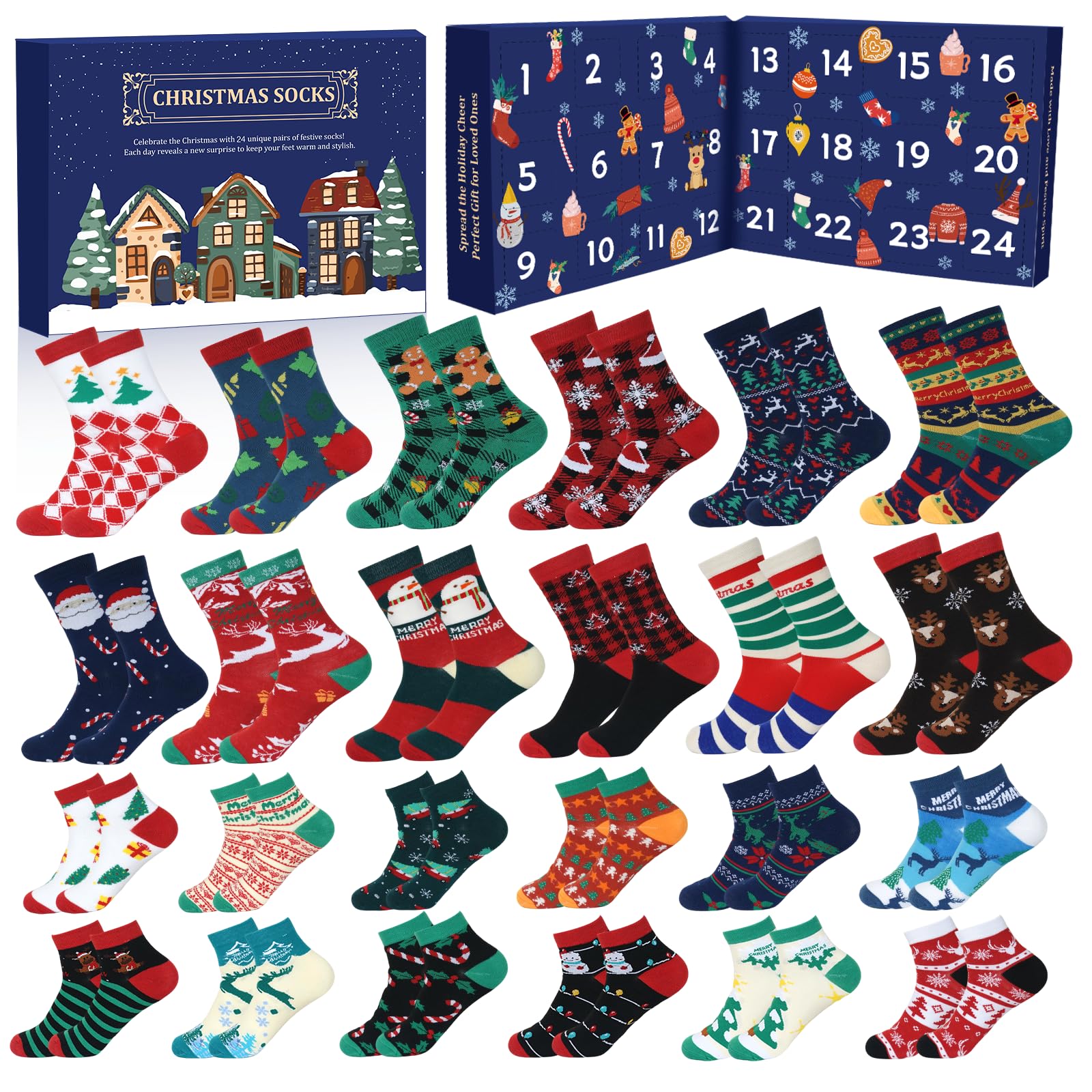 - Variety for All: This calendar boasts 24 pairs of socks, including 12 pairs of ankle socks and 12 pairs of crew socks, ensuring a diverse selection to suit every style preference. Whether you're a fan of short or long socks, there's something for everyone in this magical collection