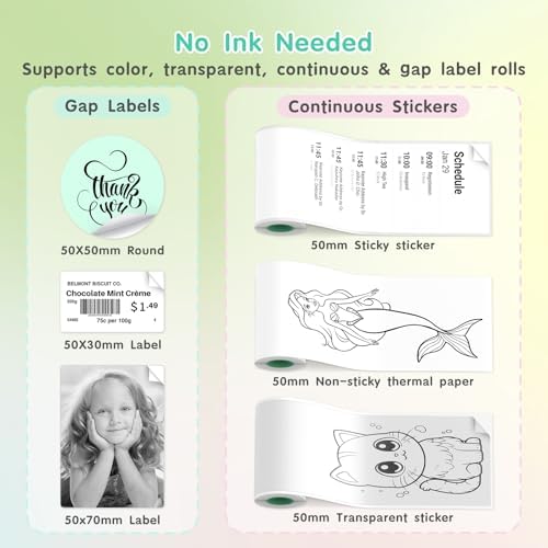 - Ink-Free Thermal Printing Technology - Enjoy clean, cost-effective printing with advanced thermal technology—no ink, toner, or ribbons required. This upgraded version is compatible with both continuous and gap labels, as well as sticky or non-sticky paper. It also supports multiple roll types, including standard white, colored, and transparent sticker paper (2-inch width).