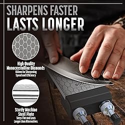 GET PROFESSIONAL RESULTS WITH COMPLETE SHARPENING SOLUTION - Diamond whetstone kit includes 8" x 2.75" dual-grit diamond sharpening plate (325 coarse/1200 extra fine), adjustable base, 3-sided knife angle guide (14°/17°/20°), chisel sharpening jig for chisels (1/8" to 1-7/8") and plane irons (1-3/8" to 3-1/8"), plus spray bottle for complete blade maintenance. ACHIEVE PERFECT ANGLES WITH RAPID EDGE RESTORATION - Coarse 325 grit quickly restores damaged or dull edges while 1200 extra fine grit delivers razor-sharp finishing. Monocrystalline diamond sharpening stones for knives provide fast cutting action while the included knife sharpening system helps achieve consistent angles for professional-quality results. LONG-LASTING PERFORMANCE WITH SUPERIOR CONSTRUCTION - Diamond stone knife sharpener features diamonds electroplated onto solid steel construction. The honeycomb surface design helps prevent clogging while maintaining the flat diamond stone surface. Built for regular use in workshop and kitchen applications with professional-grade durability. SHARPEN ANY BLADE OR WOODWORKING TOOL - Large whetstone accommodates kitchen knives, pocket knives, chisels, plane irons, scissors, axes, and cutting tools. Functions as both knife sharpener and chisel sharpening kit for various blade maintenance needs from heavy restoration to fine finishing. SAVE TIME WITH NO-MESS, READY-TO-USE SETUP - Adjustable blade sharpener holder provides stability with non-slip rubber feet. No soaking required like traditional whetstones - works with light water spray. Includes user guide with angle reference charts for optimal sharpening technique and grit progression.