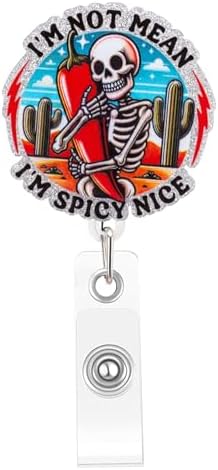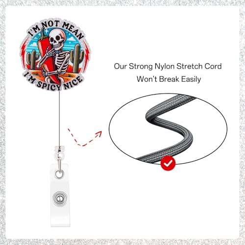 Product Features:【Unique and Humorous Design】 This badge reel features a one-of-a-kind image: a cartoon-style skull confidently holding a pepper, with large cacti in the background and the phrase “I'M NOT MEAN, I'M SPICY NICE” wrapped around it. It’s bold, eye-catching, and sure to make coworkers smile. Perfect for expressing a little fiery personality in a professional setting!【Shiny Silver Border for a Polished Look】The design is surrounded by a glossy silver border that adds an extra level of sophistication to the fun design. The contrast between the edgy skull graphic and the elegant silver trim makes this badge reel both playful and stylish.【Durable Acrylic Build】Made from high-quality acrylic material, this badge reel is built to last. It can withstand daily wear and tear in even the busiest environments like hospitals, schools, and offices. Strong, smooth, and reliable—this accessory is made to go the distance.【Retractable Cord for Daily Convenience】Equipped with a retractable rope that extends up to 22 inches, this badge holder allows you to quickly swipe or scan your ID without removing it. Whether you're at a nurse’s station, security gate, or classroom, the long cord makes movement easy and hassle-free.【Ideal Gift for Healthcare & Office Professionals】This funny and functional badge reel is a great gift idea for nurses, doctors, social workers, therapists, teachers, and more. It’s a small, thoughtful gesture that can bring humor and personality to someone’s daily routine.【Lightweight and Easy to Attach】With a secure clip on the back, this badge reel easily attaches to scrubs, pockets, lanyards, or belts. It’s lightweight and won’t pull or snag on clothing, making it comfortable to wear throughout your entire shift.