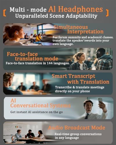 - 【Switch 5 intelligent modes】: Silent (text-only translations), Headset (private chat), Speaker (group discussion), plus Music/Call modes. Touch controls adapt instantly to business talks, gym sessions, or language learning!