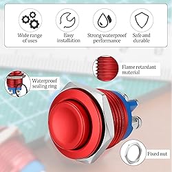 【Momentary Function】 - This 16MM push button switch operates as a momentary switch, activating when pressed and deactivating upon release. Ideal for applications requiring temporary circuit engagement, such as horns or starter buttons in vehicles. The 1NO (Normally Open) contact configuration ensures reliable performance with a mechanical life of 1,000,000 cycles. 【Waterproof Design】 - Featuring an aluminum shell and an included o-ring, this waterproof push button switch is resistant to dust and moisture. Suitable for use in boats, trucks, or other environments exposed to wet or dusty conditions, ensuring durability and long-term functionality. 【Versatile Compatibility】 - Rated for 5A AC and 3A DC, this high round push button switch is compatible with both AC and DC power systems. Its universal design makes it suitable for motor starters, access control, and other electrical circuits requiring reliable momentary switching. 【Easy Installation】 - Equipped with screw-type terminals, this 16mm momentary switch allows for tool-free wire connection without soldering. The 16mm mounting hole size ensures easy replacement or installation in panels with a thickness of 1-10mm, simplifying the setup process. 【Durable Construction】 - Made from high-quality aluminum alloy, this push button switch offers robust performance with an electrical life of 200,000 cycles. The high round cap design and red color provide both aesthetic appeal and functional durability for industrial or automotive applications.