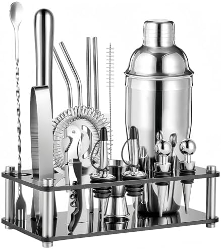18-Piece Professional Cocktail Shaker Set and Bartender Kit with Stand, Stainless Steel Bar Tools Gift Set with Muddler, Jigger, Mixing Spoon for Home Bar and Mixology