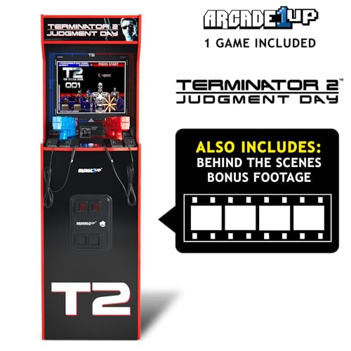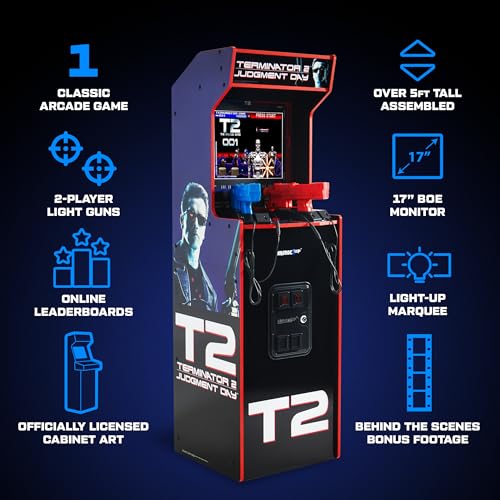 Step into a world where man battles against AI machine with the Arcade1Up Terminator 2 Deluxe Arcade Machine—a high-octane, action-packed revival that brings the iconic Terminator 2 universe to life in Arcade1Up’s iconic Deluxe format. As we face the rise of AI in our day to day lives, relive humanity’s last stand against Skynet in this one-of a kind tribute to both the Terminator 2 franchise and the legendary arcade video game. Take control of earth’s destiny with real-feel Arcade light guns, and fire with deadly precision as you obliterate swarms of T-800s and battle the relentless machines sent through Skynet’s AI. The 17” BOE color monitor delivers vivid, explosive visuals that make every chase and showdown feel like you’re part of the action, while dual speakers immerse you in the heart-pounding chaos that surrounds you. It’s not just gameplay—it’s a cinematic experience, putting you face-to-face with the potential future of AI. This machine is a true masterpiece for fans of the film, the game, and anyone fascinated by the AI-driven world we live in. This detailed cabinet, features apocalyptic Terminator 2 artwork and a glowing Light-Up Marquee, bringing back the golden age of arcades with a modern twist. Plus, enjoy the exclusive behind-the-scenes footage of the game’s creation, offering a deeper dive into one of the most iconic arcade experiences to go from the big screen to your at-home arcade. Terminator 2: Judgment Day the game, coupled with its thrilling, nostalgic gameplay, makes this a must-have for your arcade collection or a perfect machine to start you off. Whether you’re reliving the classic video game you remember or discovering it for the first time, this machine isn’t just about playing—it’s about experiencing the ultimate battle between man and AI machine. Ready to fight for the future of mankind? Don’t miss your chance to own a piece of cinematic and arcade history and fight back against AI—order the Terminator 2 Deluxe Arcade Machine today before Skynet takes over!