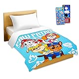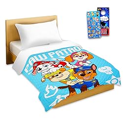 Paw Patrol Bedspread Twin Set - Bundle with Quilted Bedspread for Twin Bed, Stickers, More | Paw Patrol Room Decor Bedding Set for Boys, Girls. This Paw Patrol bedding set includes a twin-size quilted bedspread with vibrant artwork of the Paw Patrol puppies and a reversible solid-color side. Made of soft material, kids will surely love sleeping with their new Paw Patrol quilt, and parents are sure to appreciate that the bedspread is made to last. Sure to be a hit with all Paw Patrol fans, boys and girls alike, this bedding set is ideal to give to your favorite Paw Patrol enthusiast. Officially licensed Paw Patrol twin-size bedding set also includes Paw Patrol stickers, and a Beach Kids superhero door hanger.
