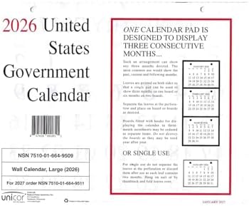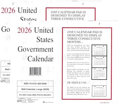 Unicor 2026, US Government Monthly Wall Individual Calendar, Qty=2/PACK, 11 x 9,12-Month (Jan to Dec) Classic 3-months-at-a-glance calendar Punched with two holes for hanging on your calendar board (not included) Federal holidays are in red Dimensions: 11W x 8 1/2H Each PK contains 2 wall calendars