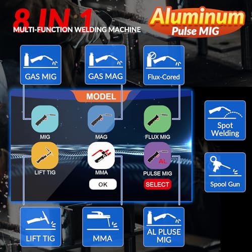 - 【 8 IN 1 Multi-functions Welder】: The GZ GUOZHI welding machine offers 8 processes: Gas MIG, MAG, Flux Core MIG, Pulse MIG, MMA/Stick, LIFT TIG, Spot Welding, Spool Gun compatible (tig torch and spool gun not included). Aluminum can be welded by using pulse MIG or a special spool gun (Asin: B0CGM1RVJF).