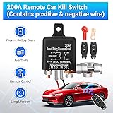 Notice - On some models of vehicles, after the remote control of this product is used to disconnect the vehicle battery and turn it on again, you need to wait about 6s before pressing the vehicle start switch to start the vehicle. Our product is according to the color of the wire to distinguish the positive and negative, black for the negative wire, red for the positive wire. The battery clip is neutral. Due to received a lot of customer suggestion, we have lengthened the black negative wire on the basis of the 200A switch first generation. Both products have their advantages. The 1st generation is easy to install; The 2nd generation can adjust the installation position as required WIDE APPLICATIONS - Remote battery disconnect switch works well for Car, Truck, RV, Travel Trailer, Camper, SUV, ATV, UTV, Marine, Van, Boat, Agricultural Vehicle Trike Auto Off Road Jeep and other engine applications with a 12 volt battery PREMIUM QUALITY - Kill Switch for Car is made of silver contact and pure copper wires. Durable and Reliable. Rated current 200A DC12V, this Battery Disconnect Isolator is upgraded from the old model as the improved fittings make mounting contacts stronger. All required wiring harnesses included, no need to buy additional accessories REPLACEMENT REMOTE BATTERY DISCONNECT SWITCH - Wireless kill switch enables you to kill your car battery power with remote control, which can help to prevent battery drain and protect the circuit. Besides, car battery disconnect switch can disconnect the power of your car, the theif cannot start and stole your car. Just press the remote control button to disconnect your car power system, easy to use and improve security