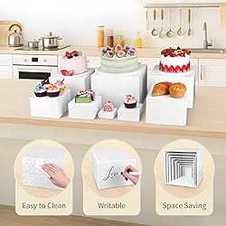 Perfectly Proportioned Design: Available in a variety of sizes—10", 9", 8", 7", 6", 5", 4", and 3"—each white acrylic sideboard riser adds a touch of elegance and harmony to any setting. Whether used alone or stacked, they create a striking display. Multiple Display Options: These acrylic cube stands feature a hollow base that allows for easy stacking and nesting, offering endless display possibilities. They're perfect for displaying cakes, small plants, jewelry, or cosmetics, perfectly blending style and functionality. Spacious Display Surface: These buffet risers feature an open design and white food display boxes, providing ample space for neatly arranged food or items for easy access. Made of durable white acrylic, they're stylish yet sturdy enough to securely store plates and glassware. Elevate Your Tablescape: Perfect for dessert tables at parties or family gatherings, these white buffet risers add a sophisticated touch and visual depth to any setting. They easily give your buffet a sophisticated, modern look. Versatile Display Tables: This white food riser set is perfect for displaying food, jewelry, perfumes, collectibles, and more at weddings, art shows, and dessert shops. They also make great photo props or thoughtful gifts, perfectly showcasing a variety of items.
