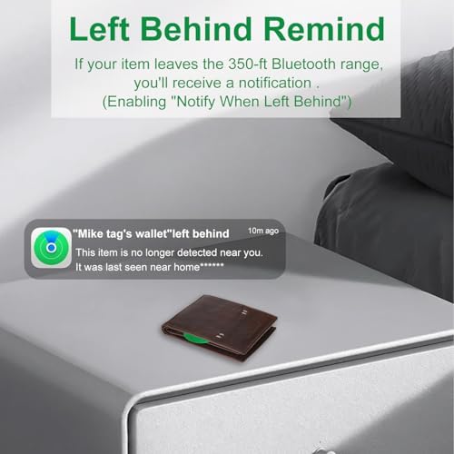 - 【Replaceable Battery】This tracker offers up to 1 year of use with a standard CR2032 battery(includes two replacement baterries), reducing frequent battery changes. When battery is low, the tracker sends a reminder to swap it or you can also check remaining power in the find my application.