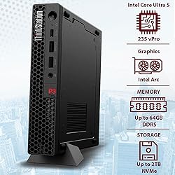 - Lenovo ThinkStation P3 Tiny Gen 2 Powered by Intel Core Ultra 5 235 vPro, this 1L mini workstation is built for business, AI, and hybrid work.Performance 14 cores (6P+8E), 16 threads Up to 5.0GHz Max Turbo Built-in AI Boost NPUMemory & Storage Up to 64GB DDR5-5600 Up to 2TB PCIe Gen5 NVMe SSDGraphics & Display Integrated Intel Graphics Supports 4K via HDMI 2.1 & DP 1.4Operating System Windows 11 Pro with enterprise toolsFront Ports 1x USB-C 3.2 Gen2x2 (20Gbps) 2x USB-A 3.2 Gen2 1x Headphone/Mic ComboRear Ports 3x USB-A 3.2 Gen2 1x USB-A 3.2 Gen1 1x DisplayPort 1.4 1x HDMI 2.1 1x RJ-45 LANExpansion Options Optional Thunderbolt 4, VGA, Serial, Dual LAN, 2nd HDMI or DPWireless Wi-Fi 7 (802.11be) Bluetooth 5.4Included Accessories Power & Size 230W External Adapter 1.44" x 7.05" x 7.20", 2.91 lbs Color: Raven BlackDurability & Security MIL-STD-810H Certified vPro Platform with remote managementEco-Friendly Recycled materials ENERGY STAR 8.0 & EPEAT Gold FSC-certified packagingIdeal for professionals, remote work, and edge deployments.