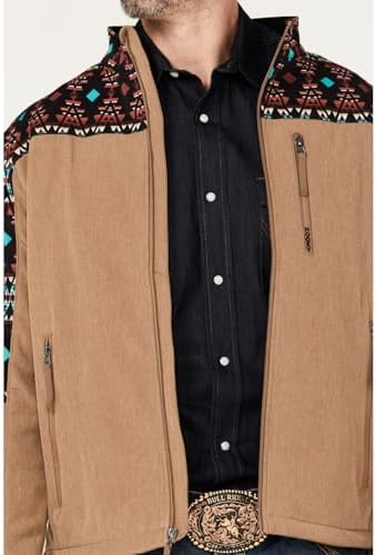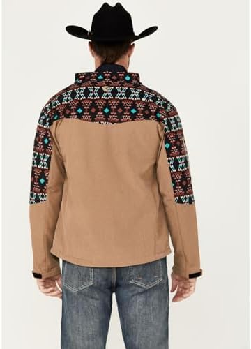 This Hooey Tan/Aztec men's softshell fleece jacket provides excellent wind protection and water resistance, thanks to its ultra-soft fleece lining. Ideal for cool or cold weather, this durable jacket features multifunctional hidden pockets and a headphone holster. Made from 96% Polyester and 4% Polyurethane, it's perfect for casual everyday wear. Key details include a Hooey Ride-Tight Adjustable Waistband, Velcro Adjustable Cuffs, and a Standard Fit.
