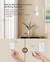 Replace Pull Chain Switch - Plug and play! No wiring needed to add switch for light bulbs, pre-programmed for immediate use. The responsive remote control can turn your lights on and off instantly with no lag. No getting up or fumbling in the dark, making everyday convenience effortless. Dual-Use Detachable Magnetic Switch - The sleek Decorator Rocker Switch is compatible with standard or multi-gang wall plates, can be used as a wall switch or a portable handheld switch. Easily detach the switch from the wall plate and securely stick it to any metal surface, offering flexible placement while blending seamlessly with existing switches. 200 FT Longer Remote Range - Strong RF signal of this remote light switch can work through walls, doors, and windows, giving you the freedom to place the switch wherever it's most convenient for you. Control your lights effortlessly, even from a distance. Shorter Light Socket - Compact design, adding only 1.77". Crafted from high-temperature-resistant PBT material, rated for LED/CFL up to 60W and incandescent bulbs up to 100W; standard E26/E27 base works with most lamps and bulbs, making it great for pull chain light fixtures, hard-to-reach places, stairs, basement, garage, etc. Programmable and Expandable - Free Pairing, No Interference! This remote control light socket can be expanded with additional treewell wireless light switch and receiver kits; allowing you to activate multiple devices with one switch or control one device with multiple switches. Easy pairing/programming, making your life easier.