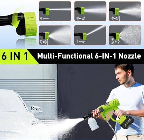 - [6-in-1 Nozzle & Foam Cannon Included] One nozzle, six spray modes: 0°, 15°, 25°, 40°, shower, and up. Tackle everything from delicate rinsing to tough grime. Bonus foam cannon turns it into a mobile car washer or soap sprayer in seconds.