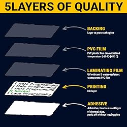 - 3 Pcs I Hate Programming It Works I Love Programming Stickers – Funny Tech Quote Decals for Programmers, Developers – Gifts for Software Engineers – for Laptop, Water Bottle, Tumbler – 3"x3" Waterproof: Our sticker is deal for use in damp or muggy conditions because it is made to be totally waterproof. Applying it to surfaces like water bottles, car windows, and even boats can be done with confidence. UV Protection: Our outdoor stickers offer protection against UV rays from exposure to sunlight, rain, and wind, among other factors that qualify them for outdoor use. Durable: The premium vinyl used to make the stickers is intended to be weather- and scratch-resistant. It is designed to endure years in the weather. Precision die-cutting: With the use of cutting-edge die-cutting technology, your design is accurately, crisply, and cleanly cut out of our sticker. Additionally, this technology makes it simple to modify the sticker to meet your unique design requirements. Versatile: You can use our sticker on a lot of different things, such as water bottles, laptops, cars, and more. Furthermore, it is appropriate for both indoor and outdoor use due to its waterproof qualities. Easy to apply: No special tools or techniques are required to apply our sticker; it is designed to be that simple. Simply peel off the backing and apply it to any smooth surface. Furthermore, it is simple to remove the sticker without leaving any trace.
