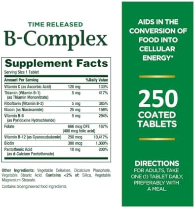 Natures Bounty Time Released B-Complex with Vitamin C & Folic Acid, Energy Health Support, Aids Food to Energy Conversion, 250 Coated Tablets