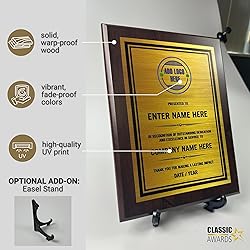 FULLY CUSTOMIZED PLAQUE - Customize ALL contents for your personalized plaque with ease. Simply upload your logo, photo, and a heartfelt personal message or quote. Choose from 3 frame types (walnut/black), top color (silver/gold/black), font and font color to tailor the plaque to any event and make it truly unique. PREMIUM FINISH AND FRAME TYPES - Our frames are carefully chosen by our skilled artisans, ensuring a smooth and refined finish. Whichever color you choose - Walnut, Matte Black - they both feel luxurious, making them suitable for awards, gifts, and professional recognition. SOLID WOOD PLAQUE - Not just made as a personalized award plaque but also a keepsake, this custom plaque is crafted from solid wood that's naturally strong and long-lasting. It resists wear and tear, doesn't warp or swell over time. OPTIONAL ADD-ON: Easel Stand (Click the easel option upon customization) CRISP VIBRANT PRINT - With high-quality full-color UV printing, the graphics and texts appear vibrant, sharp and clean, and don't peel or crack over time. For better results, make sure to upload photos with at least 300 dpi. VERSATILE USE - This suits a wide range of use: retirement plaque, employee of the month plaque, memorial plaque, appreciation plaque, teacher of the year plaque, business anniversary gifts, or pastor appreciation plaque. Whether for formal events or you simply want to express your gratitude to anyone for their service and dedication, this custom plaque got you!