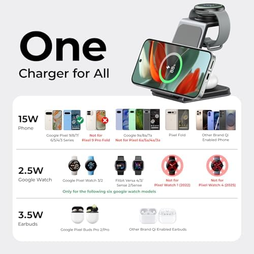 - Charging Station For Multiple Devices: 2.5W Pixel Watch: designed for Google Pixel Watch 3/2, Fitbit versa 4/3/sense 2/sense (Note: not for google pixel watch 1/4). 15W Phone: for Google Pixel 10/9/8/7/6/5/4/3 series, Pixel Fold (Note: not for Pixel 9 Pro Fold, Pixel 6a/5a/4a/3a/2a); and other Qi-Enabled phones. 3.5W Earbuds: for Google Pixel buds pro 2/pro and other Qi-Enabled Earbuds. Don’t recommend using the following types of cases with our charger: 1. The regular/magnetic case with a thickness ≥3mm; 2. cases with a ring stand or metal ring on the back; 3. Magnetic wallet cases; 4. Magnetic battery cases; 5. Non-magnetic cases with a metal magnetic ring attached to the back.
