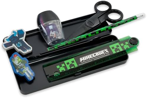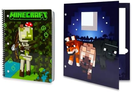 - Includes a Minecraft portfolio folder, a one-subject 70-sheet notebook, pencil case, eraser, pencil sharpener, folded ruler, 2 pencils, a twisty pencil, and scissors.