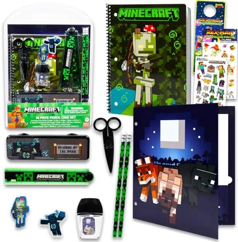 Minecraft Back to School Value Pack Set - Minecraft Folder, Notebook, Erasers, Stickers, and More | Video Game School Supplies Bundle. This Minecraft back-to-school set includes everything you need to be ready for the classroom, featuring everyone's favorite blocky characters Steve, Alex, and Creeper. Includes a Minecraft portfolio folder, a one-subject 70-sheet notebook, pencil case, eraser, pencil sharpener, folded ruler, 2 pencils, a twisty pencil, and scissors. The Minecraft school supplies set also includes Minecraft stickers, a Rex-Man sticker sheet, and a Rex-Man door hanger — perfect for Minecraft rewards, motivational stickers, party supplies, and party favors. All Minecraft school products are officially licensed for girls and boys. Manufacturer Minimum Age 3 Years and Old.