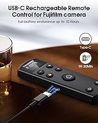Compatible with Fujifilm multiple models: Our camera remote shutter release for Fujifilm X100 VI, X-M5, X-T30 II, X-E5, X-T5, X half, X-H2S, X-T30, X-T4, X-T3, X-S20, X-S10, X-T50, X-H2. Please put both the camera and the remote into pairing mode to get it connected, and compatible with the above model. Rechargeable and upgradeable remote control: Built-in rechargeable battery with universal Type-C charging port, full battery life up to 10 hours, the Type-C port on the remote control can also be used for firmware upgrade, you can upgrade the firmware of the remote control in case of incompatibility due to future camera upgrades. Zoom Control: Press the (-) button on the remote control to zoom to the wide-angle side or the (+) button to zoom to the telephoto side. Zoom speed is controlled by the distance the button ispressed.Press the button halfway down to zoom slowlypress it all the way down to zoom fast. Note: The zoom function is available only for power zoom lensesand when the camera supports remote zoom.Remote zoom is only available with zoom lenses. Multi-function wireless camera remote control for fuji: Supports auto focus(Press the button halfway to focus, the camera must be set to autofocus mode), instant shooting mode, short video recording and control lock button(Prevent accidental contact). Features quick pairing, all-round operation functions, and a wireless range of up to 10 meters (32.8 feet). OLED display screen: This wireless remote shutter release for Fujifilm clearly shows all status indicators and function settings, enabling you to monitor operations, battery level, and pairing status at a glance.