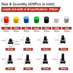 - Upgrade Your Electronics Projects with a Complete Tactile Push Button Switch Kit! This 420-Piece Tactile Push Button Switch Assortment Kit is perfect for prototyping, repairs, and custom builds. With switches in 8 heights and 7 vibrant button caps, you’ll have the right components for any project. Key Features:✔ 8 Switch Heights – Includes 6x6x6.5mm, 6x6x7mm, 6x6x8mm, 6x6x9mm (30Pcs each), plus 6x6x10mm, 6x6x10.5mm (25Pcs each), and 6x6x11mm, 6x6x11.5mm (20Pcs each).✔ 7 Color Caps for Easy Identification – 30Pcs each of Red, Yellow, Blue, White, Green, Gray, and Black (6x6x6mm).✔ Reliable Performance – Strong conductivity and a lifespan of 100,000+ presses.✔ Wide Applications – Suitable for Electronics, PCB Prototyping, DIY Projects. Great For:Circuit board prototypingDIY electronics and roboticsCustom control panelsKeyboard modificationsScience and engineering learning projects
