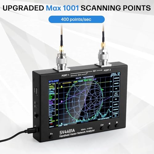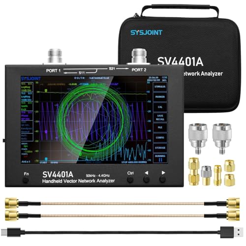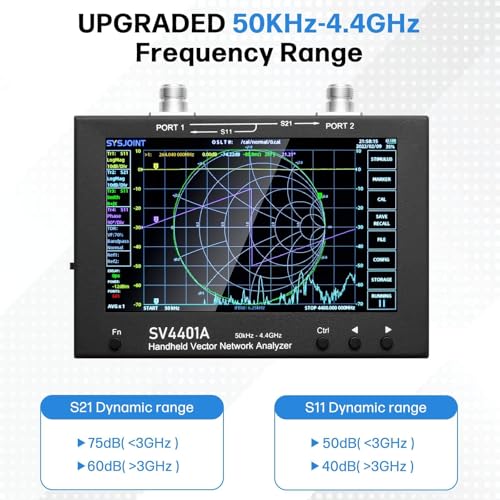 - [Wide-Frequency Range] The SV4401A is a high-performance handheld VNA with a measurement frequency range of 50kHz-4.4GHz. It is capable of measuring S11 and S21 parameters—with a dynamic range of 50dB for S11 and 75dB for S21—delivering reliable accuracy for your testing needs. Ideal for testing MF/HF/VHF/UHF band antennas (shortwave, ISM, WiFi, Bluetooth, GPS). It also works for measuring RF components (filters, amplifiers, attenuators, cables, power dividers, couplers, duplexers)